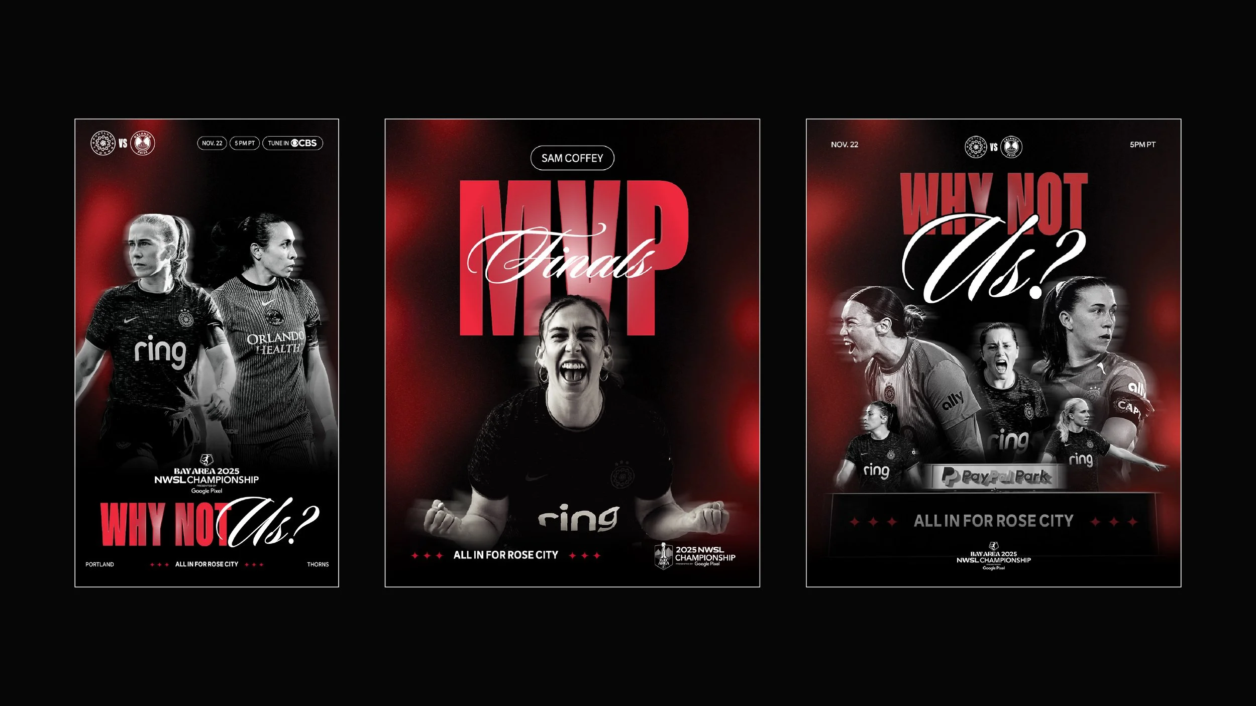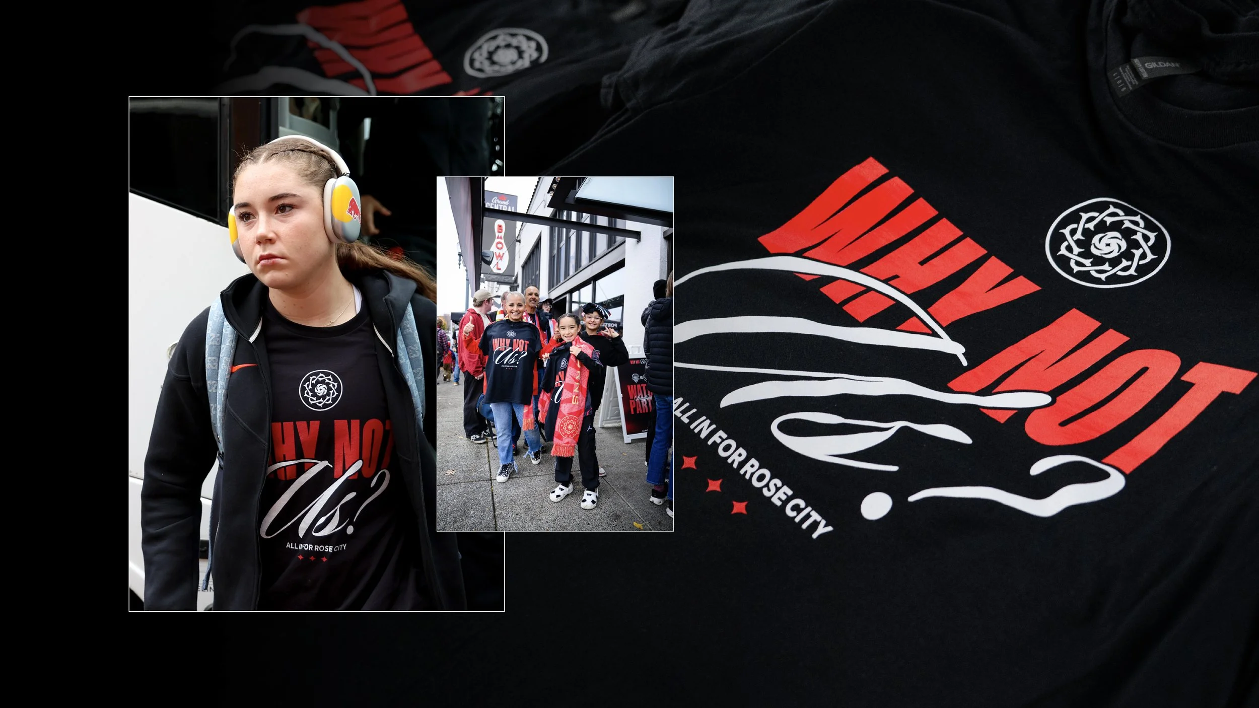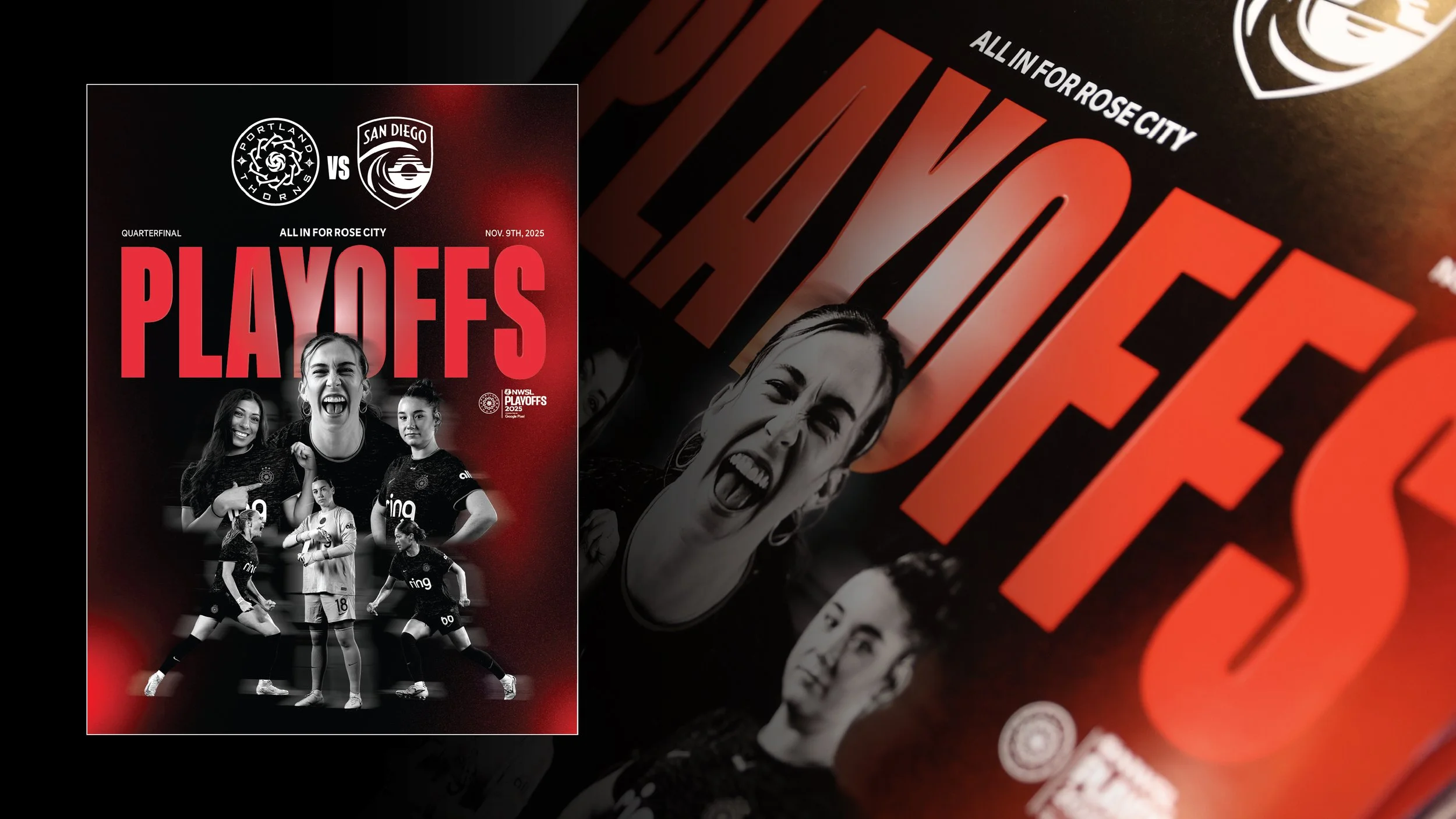 Inspired by this resilience, we built a bold, unapologetic visual identity for our playoff campaign. Dramatic black-and-white portraiture paired with striking abstract gradients created a look that was both raw and electric. The campaign came to life across match-day assets, merchandise, stadium LEDs, and even a first-of-its-kind watch party for the Thorns and the city of Portland.
